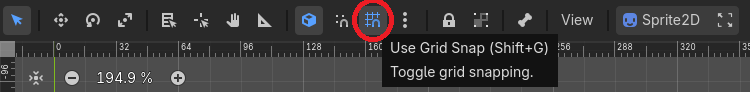 As we’re creating a tile-based game with a fixed tile size, we can modify the Godot 2D scene display to show an appropriately formatted grid. In the scene menu bar, press Shift + G or click the Use Grid Snap button to display the grid.