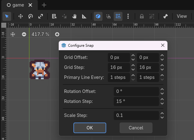 Set Configure Snap -> Grid Step to 16, 16 to have the grid squares match our sprite size.
