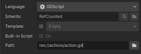 Create a new folder called actions. Add a new script called action.gd which inherits from RefCounted instead of Node.