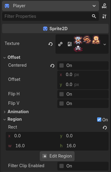 Enable Sprite2D -> Region and set w := 16, h := 16. This will display a 16 x 16 pixel region of the spritesheet we loaded. In Part 3 we’ll use this to display different types of characters.