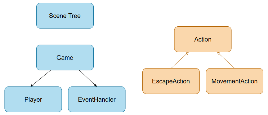 The Game, EventHandler, and Player are all nodes that persist in the scene tree throughout the life of the game. Actions, on the other hand, are constantly being created and destroyed in response to player input. Godot provides us with a lightweight object class called RefCounted 2 that we can use as the base for our Actions. RefCounted objects are effective for encapsulating data and logic, while not existing as part of the scene tree.