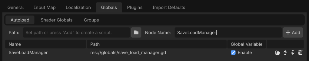 While we save our game state from within an active Game instance, later we’re going to want to load a game from a startup screen. With that in mind, we’ll register our SaveLoadManager as a global autoload. Godot will automatically attach autoloads to the game root at runtime.