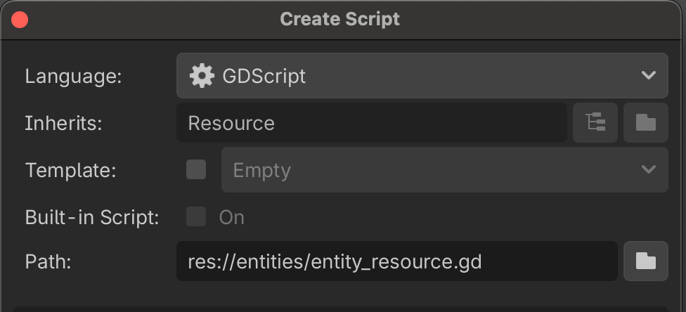 Create a new script in the entities directory called entity_resource.gd. entity_resource.gd should inherit from Resource instead of Node: