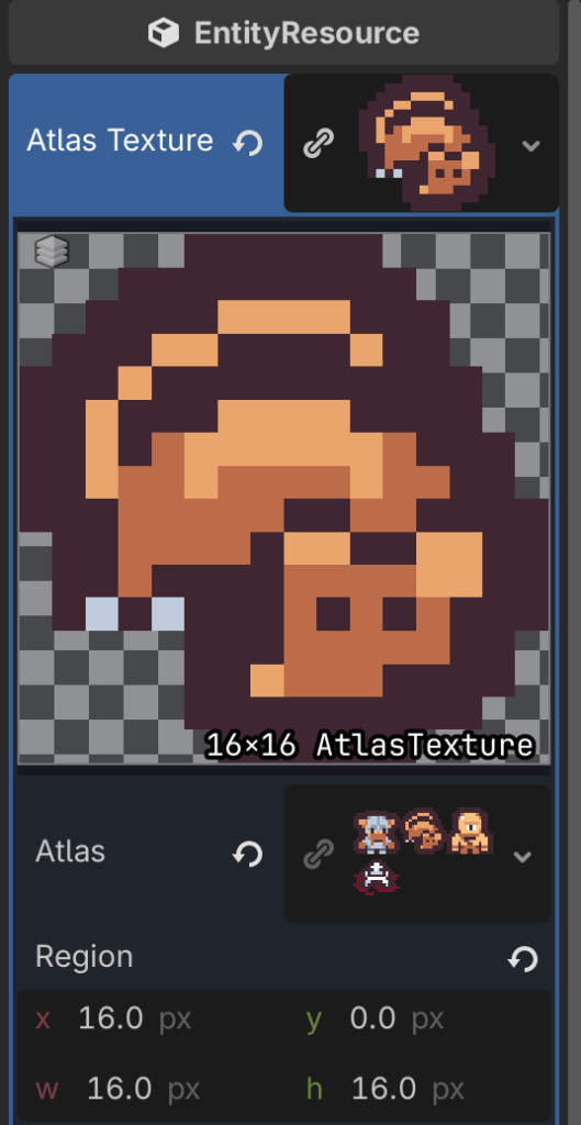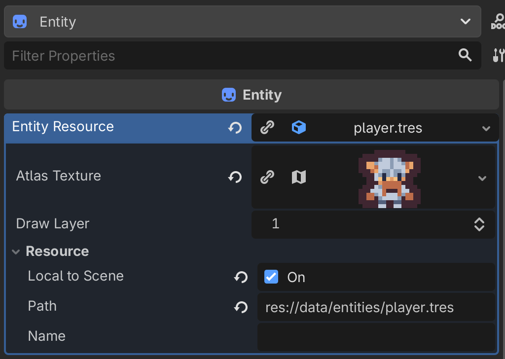 EntityResource contains an atlas_texture to hold our sprite data, as well as a draw_layer upon which the entity will be rendered. We’ll give draw_layer a default value of 1 to ensure that our Entities are always drawn on top of the background.