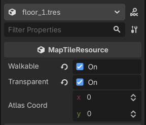 Open floor_1.tres. Set walkable and transparent to true.