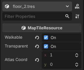 Our map tiles declares two flags: walkable defines whether or not the player can move through a tile, while transparent defines if a tile blocks line of sight. We’ll come back to this in part 5 when we implement Field of View. The atlas_coord property defines which dungeon_tiles_spritesheet.png sprite to render.