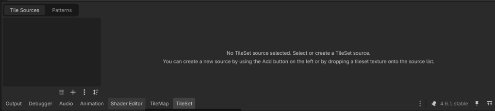 At the bottom of the Godot editor you should see a new tab called TileSet (if you don’t see this tab, make sure the Map node is selected). Click on the TileSet tab.