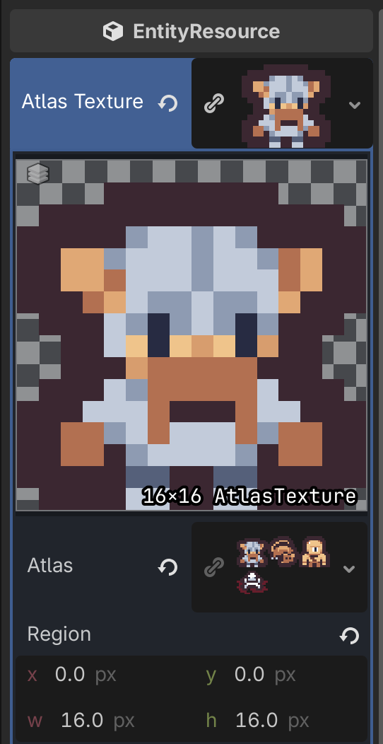 Our unit_spritesheet is laid out as a 3 x 2 grid of 16 x 16 sprites. Set Atlas Texture -> Region -> w and h to 16 x 16.
