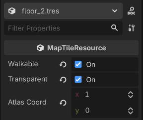 Open floor_2.tres. Set walkable and transparent to true, then set atlas_coord to (1, 0)