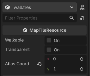 Our map tiles declares two flags: walkable defines whether or not the player can move through a tile, while transparent defines if a tile blocks line of sight. We’ll come back to this in part 5 when we implement Field of View. The atlas_coord property defines which dungeon_tiles_spritesheet.png sprite to render.