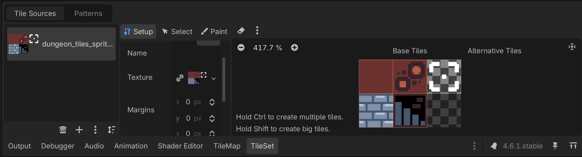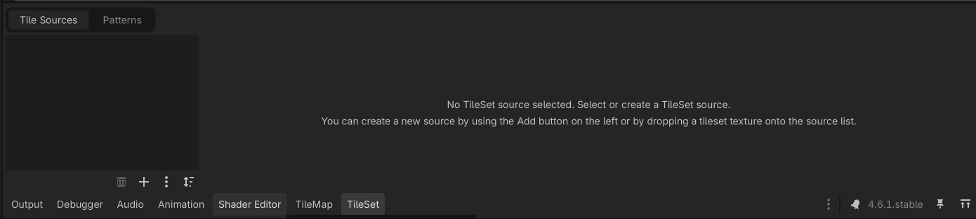 At the bottom of the Godot editor you should see a new tab called TileSet (if you don’t see this tab, make sure the Map node is selected). Click on the TileSet tab.